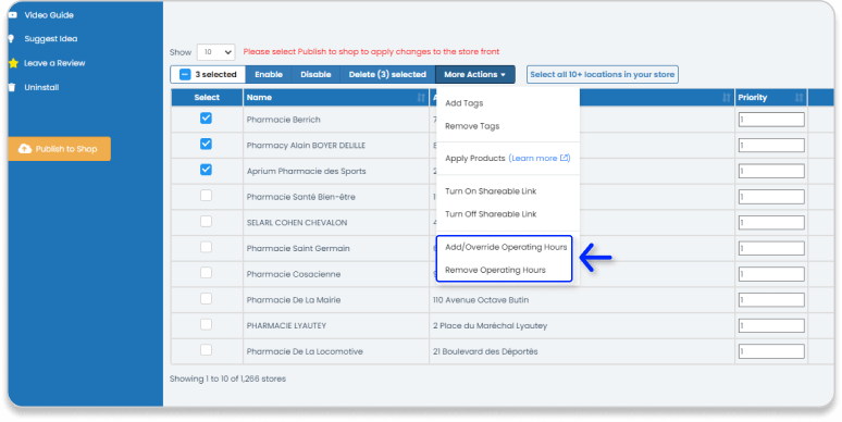 After selecting more than one location, select the More Actions dropdown button to select Add/Override Operating Hours or Remove Operating Hours.