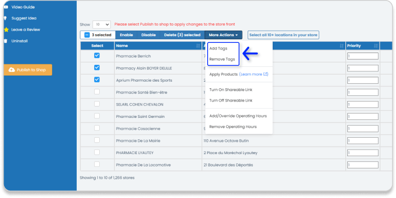 After selecting more than one location, select the More Actions dropdown button to select Add Tags or Remove Tags.