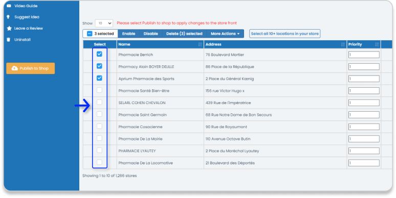 After selecting more than one location, select the Enable or Disable button. This will enable or disable the selected location. Please note, after enabling/disabling, please select the publish button to apply the changes to the store front: