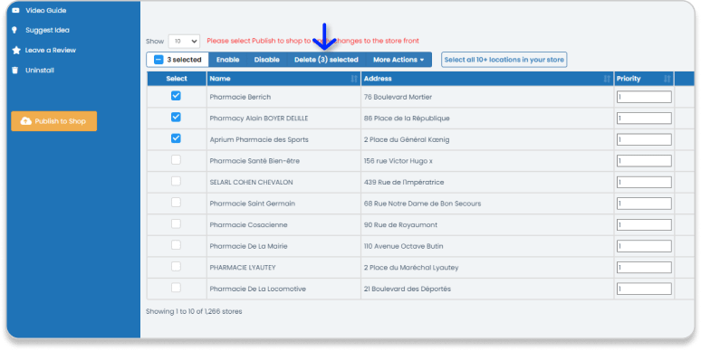After selecting more than one location, select the Delete button to bulk delete multiple locations. After deleting please select the publish button to apply the changes to the store front.