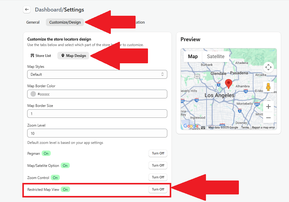 - Go to the Customize Design section and then to the Map Design tab, turn on the toggle for Restricted Map View: