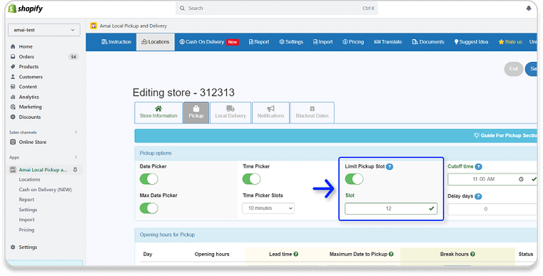 - If you want to limit the number of orders that can be placed within a time slot, you can enable the Limit Pickup Slot feature. Then, enter the number of slots that you allow your customers to take.