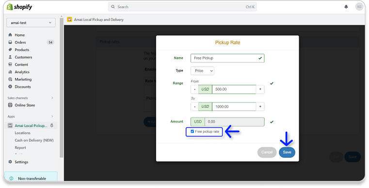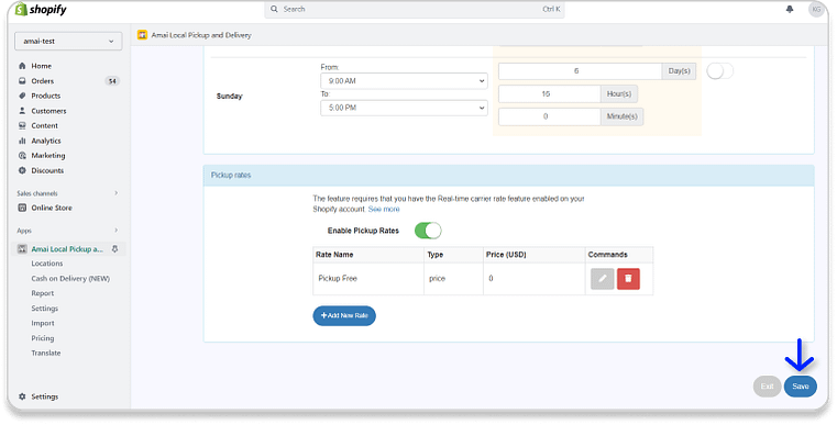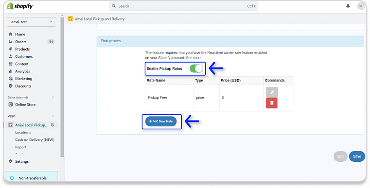 - Enable Pickup Rates to set the pickup price condition at a certain price/weight range of the product. → Click + Add New Rate