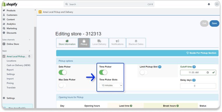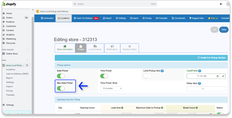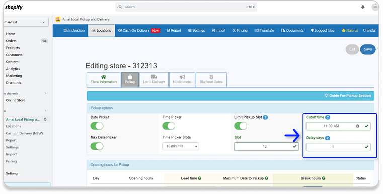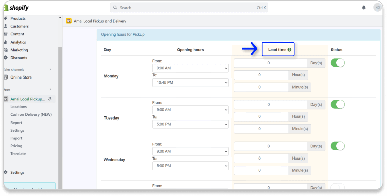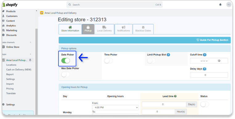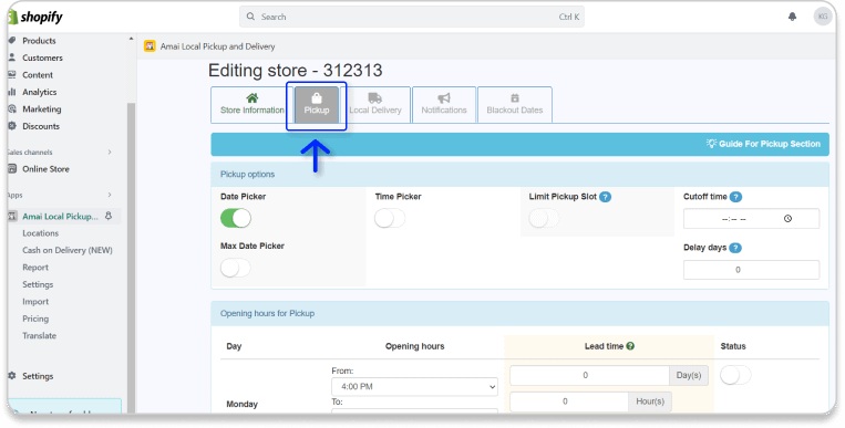 Once you enable this feature, your customers have to choose a date to pick up their orders.You can customize the dates in the Opening hours for Pickup part. In this part, you can set up the Lead time (The time that customers have to check out before the day they want to pickup).