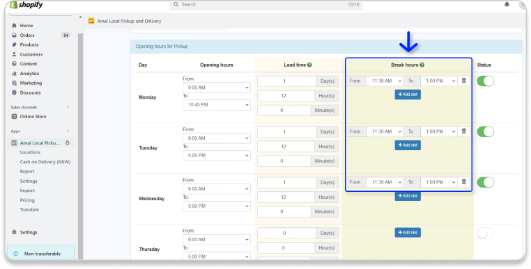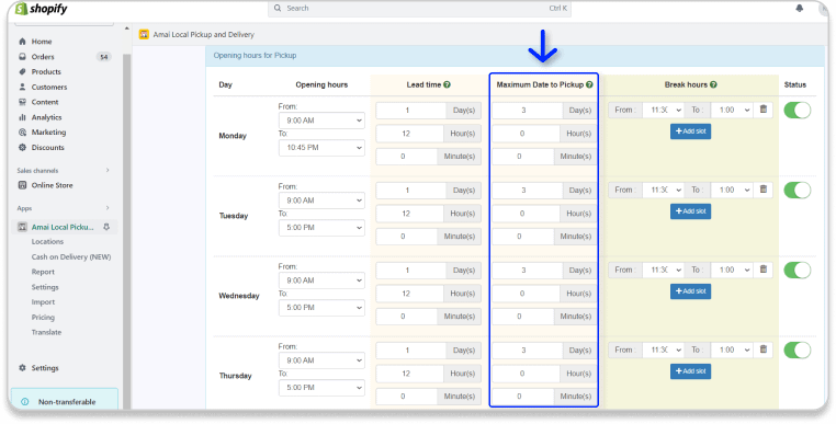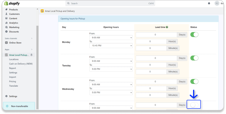 Turn off Status of the days your store is closed. In this example, we are closed on Saturday and Sunday (Customers can’t pick-up in these 2 days).