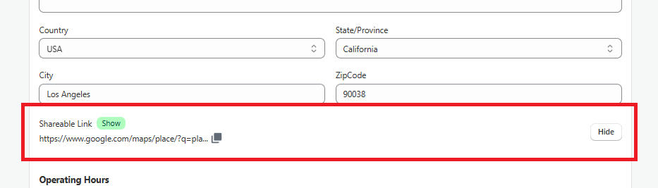 • When the Shareable Link toggle is enabled, a Share button will be shown next to your store address in the map:
