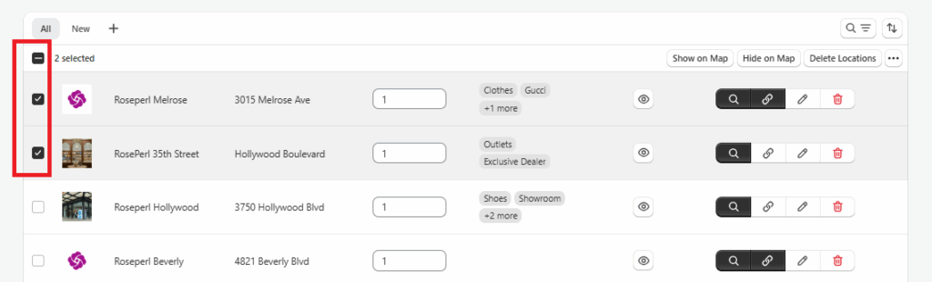 • On the Store Locator page, select multiple stores using the lefthand checkbox: