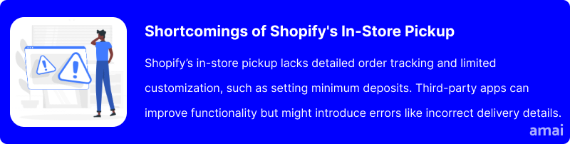 While integrating in-store pickup for Shopify is straightforward, it comes with its set of limitations. One notable drawback is the lack of comprehensive visibility into pickup orders, along with limited options such as setting minimum deposits for pickups. Many third-party apps also face common problems like jumbled delivery dates and inaccurate addresses. These issues can result in customer dissatisfaction, undermining the app’s intended benefits. However, with certain third-party apps from the Shopify store, you’ll be able to sort any in-store pickup integration without any burdening hassle.